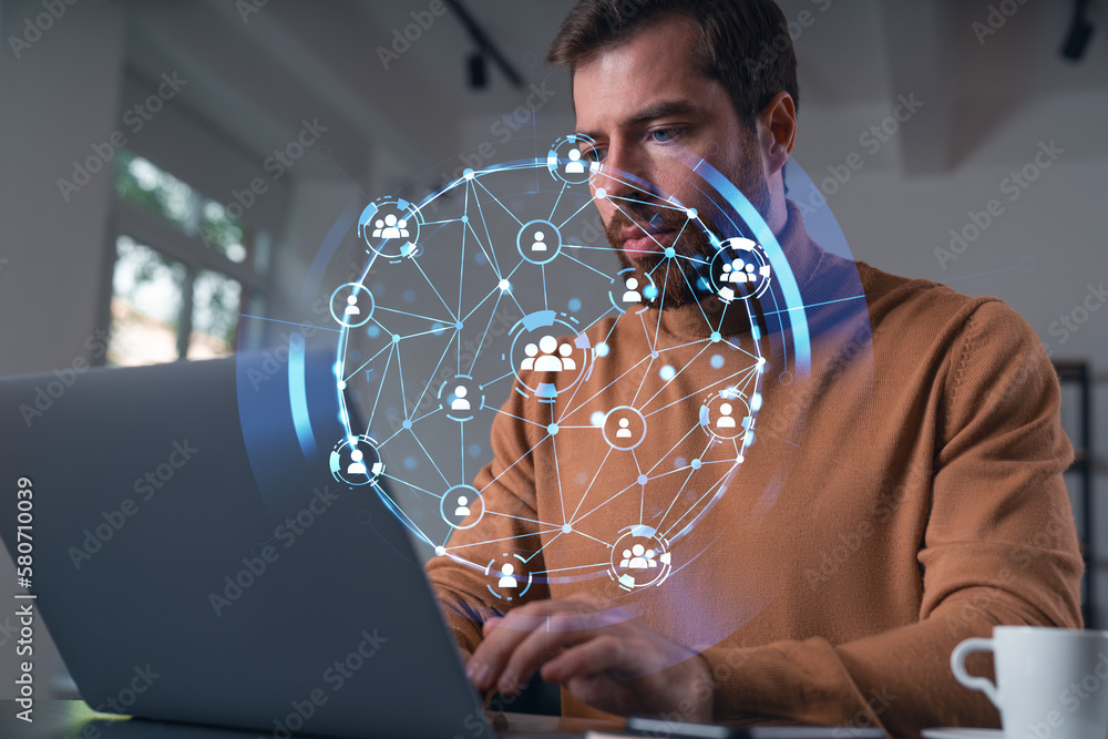 Thoughtful businessman in casual wear typing on laptop at office workplace. Concept of distant work, business, internet surfing, information technology. Social network hologram