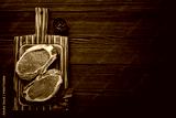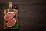 Cut raw meat pork steaks with seasonings on kitchen cutting board, rustic wooden background top view, ready for BBQ. Pork loin chops, space for text