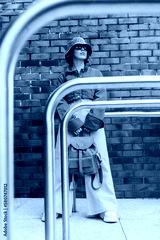 Hipster fashion young woman in bright clothes, sun glasses and bucket hat with backpack bag on the gray brick wall background. Urban city street fashion. Vertical card. Selective focus. Copy space.