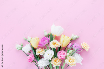 Bouquet of beautiful spring flowers on pastel pink table for Happy mothers day. Flat lay.