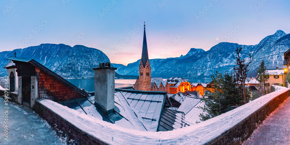 Famous Hallstatt mountain village in the Austrian Alps at sunrise, Austria