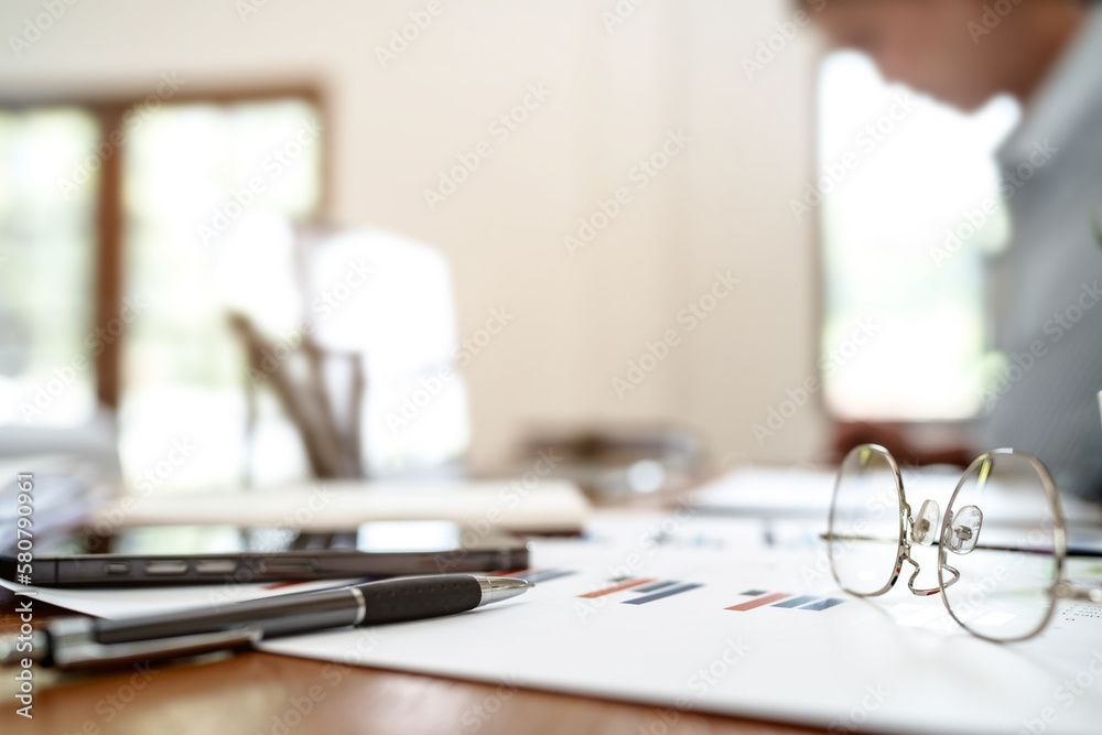 Startup business people calculating a valuation in workplace, Selective Focus on pen..