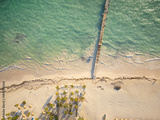 White sandy beach, pier on the sea. Hotels, cottages, swimming pools, palm trees. Resort place. Vacation, seaside resort, swimming, vacation, romance.