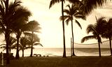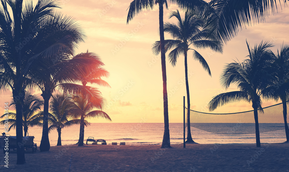 Tropical beach with coconut palm tree silhouettes at sunset, color toning applied.