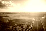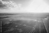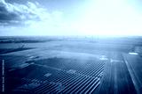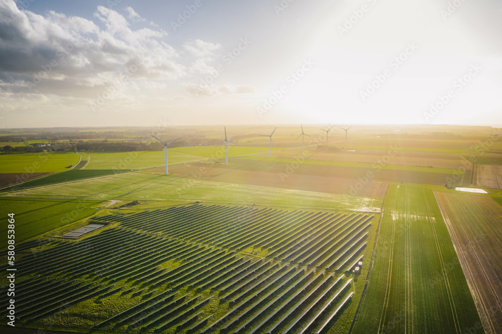 Wind turbines and solar panels farm in a field. Renewable green energy. Sunny landscape, electric energy generator for clean energy producing concept.