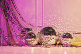 Shiny disco balls and foil fringe curtain indoors, color toned
