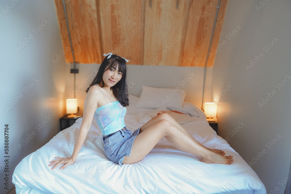 Sexy asian woman wearing a sexy dress sitting on the bed