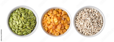 Pumpkin seeds, raisins, Job's tears in white bowl on transparent png