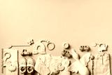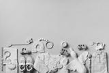 Set of baby stuff and accessories for newborn on brown background. Baby shower or baby care concept. Flat lay, top view. Knitted sweater, pants, shoes, bib, wooden toys and soft bird.