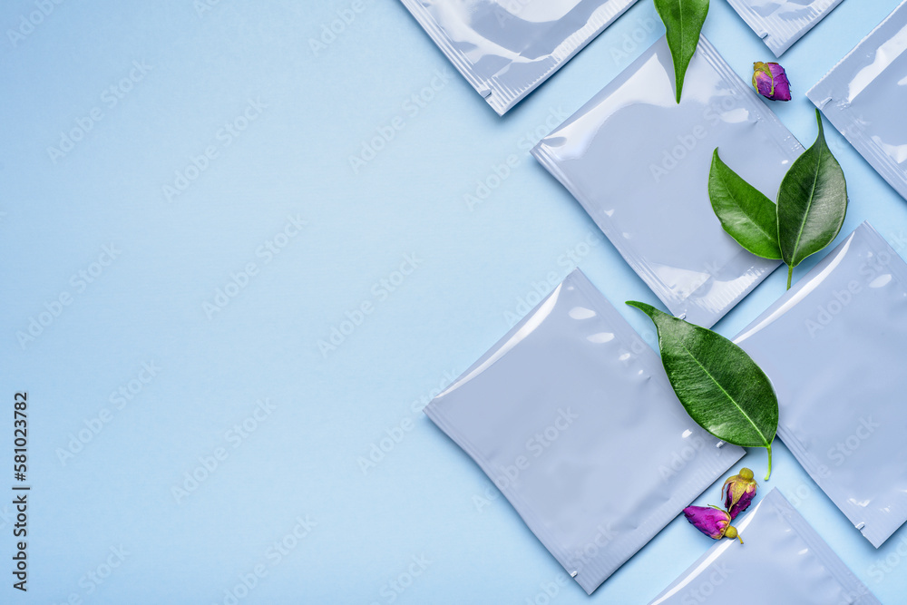 Blue plastic tea bag sachets or envelopes with dry rosebuds and green leaves.