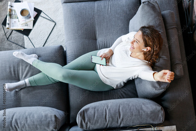 Relaxed young woman on sofa with smart phone and listening to music