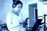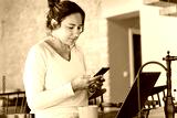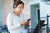 Young woman entrepreneur working from home. Businesswoman using laptop in kitchen