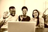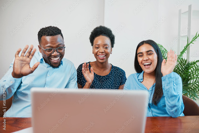 Three colleagues smile and wave at laptop screen, remote meeting conference call