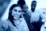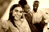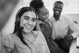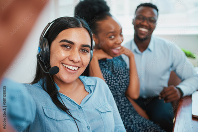Selfie in the office, call centre agents pose and have fun, teamwork success