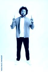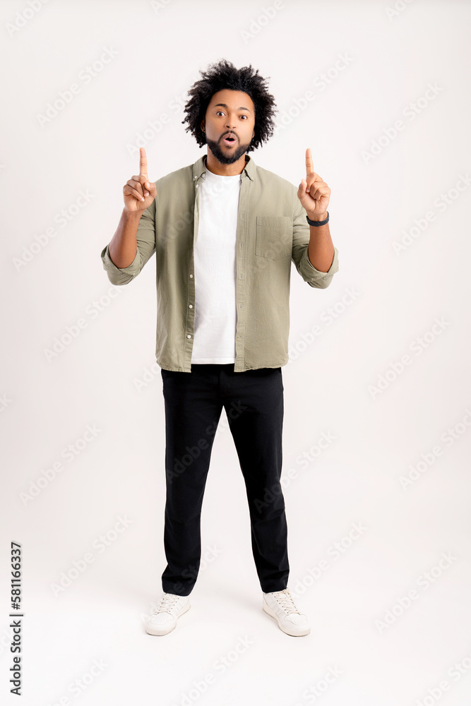 Look, advertise. Cheerful guy pointing up place for commercial idea, looking at the camera with shocked face. Studio shot isolated on white background