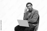 Excited young african-american man in trend hat and shirt came up with new idea or solution, pointing finger up, sitting with laptop on laps isolated over white background