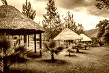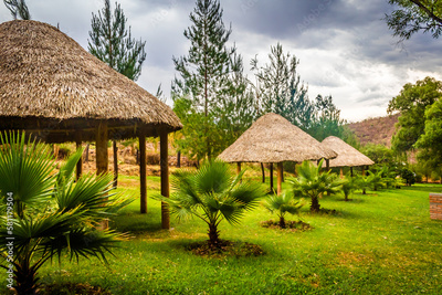 rustic umbrellas in green garden in middle of the forest, san pablo pastoria in monte escobedo zacatecas