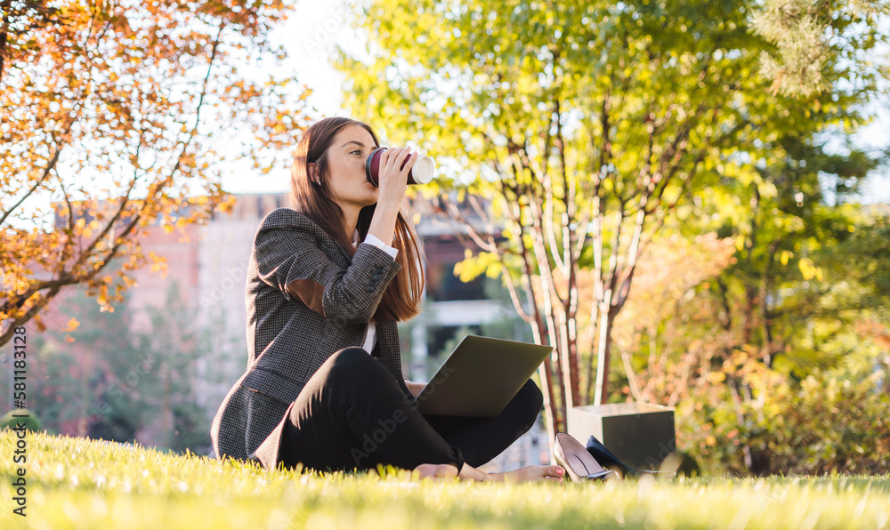 Caucasian business woman sitting outside enjoying tasty coffee while working on laptop computer device. Wireless remote digital technology, outdoor nature with