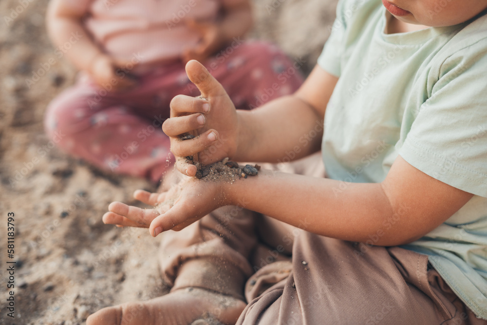 Image of a boy playing and exploring the sand in garden. Little garden. Summer vacation. Healthy lifestyle vacation. Garden nature.