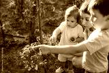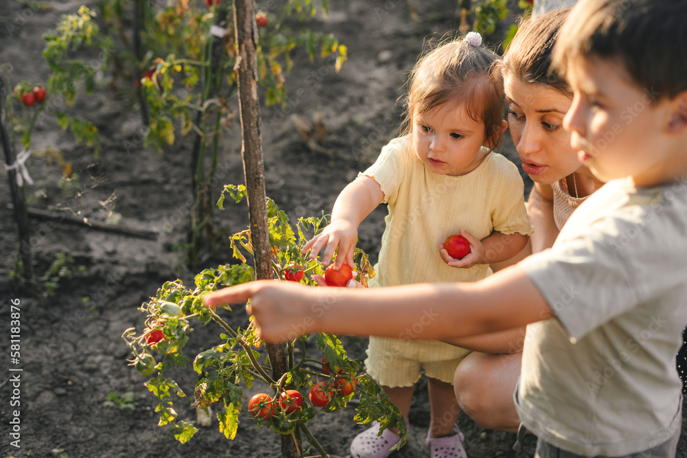 Mother and two kids checking red tomatoes in their greenhouse. People lifestyle. Mother nature. Garden nature.