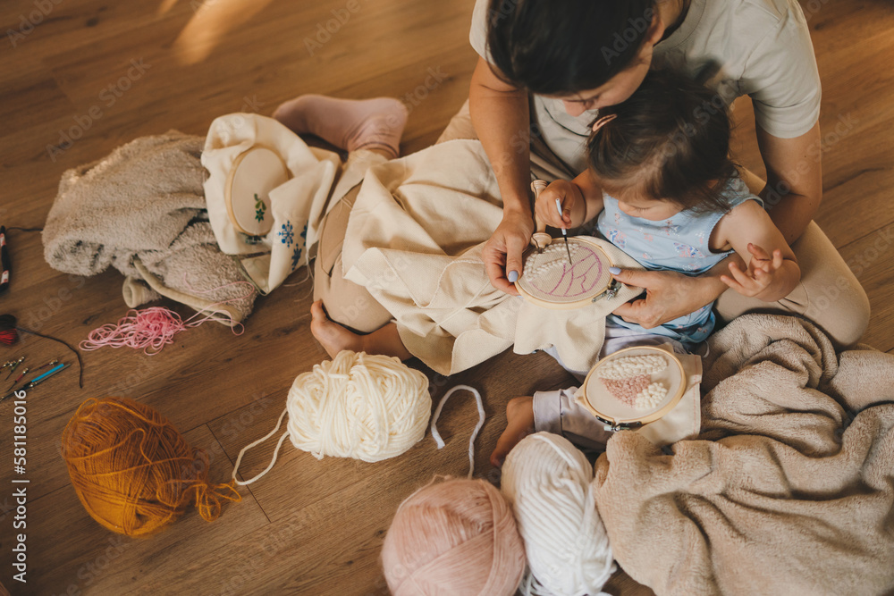 Top view of a mother teaching child crafting, hobby for family with children, at home. Pastime, spend time together concept