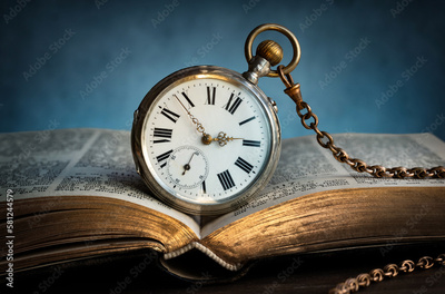 The clock lies on an old book. Clock as a symbol of time, the book is a symbol of knowledge and science. Concept of time, history, science, memory, information. Vintage watch, clock background.