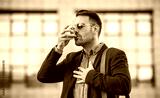Stress and asthma. Young businessman treating asthma attack with inhaler. Health care concept