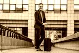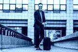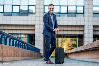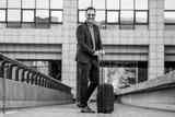 Stylish businessman with suitcase goes to travel. Transportation concept