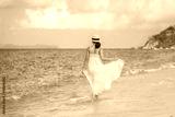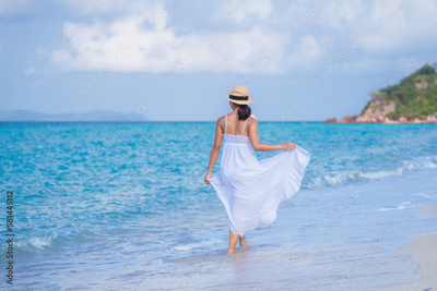 Happy sexy asain traveller woman in white beach dress and hat show enjoys on tropical beach vacation in summer holidays