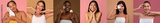 Smiling millennial international women apply cream, cleanse perfect skin, enjoy spa treatments