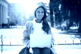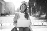 Beauty african woman working with laptop sitting on the street