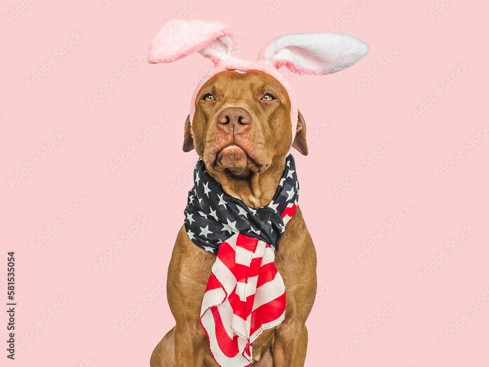 Cute puppy, bunny ears and American Flag. Close-up, studio shot. Day light. Concept of care, education, obedience training, raising pet