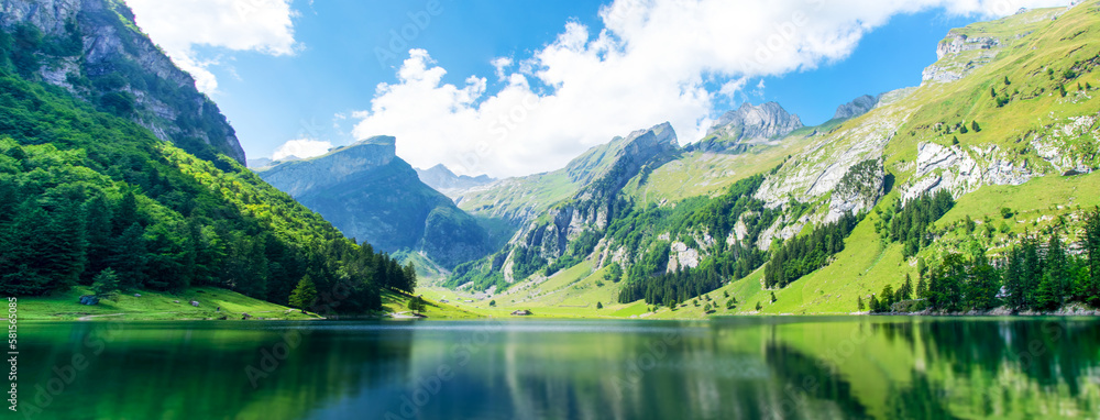 Lake in the Swiss Alps. Panoramic view of the nature and mountains of Switzerland.