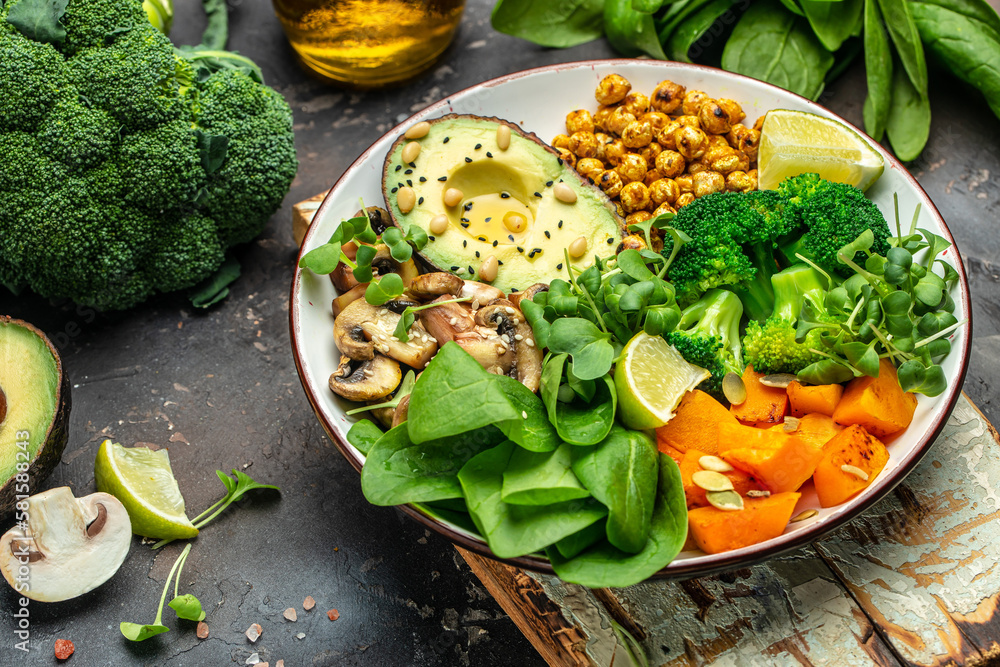 Green vegetable vegan salad with avocado, mushrooms, broccoli, spinach, chickpeas, pumpkin. Healthy vegetarian food concept. top view