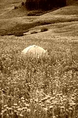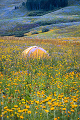 Camping tent in the middle of rocky mountain wildflower meadow, near Crested Butte, Colorado.