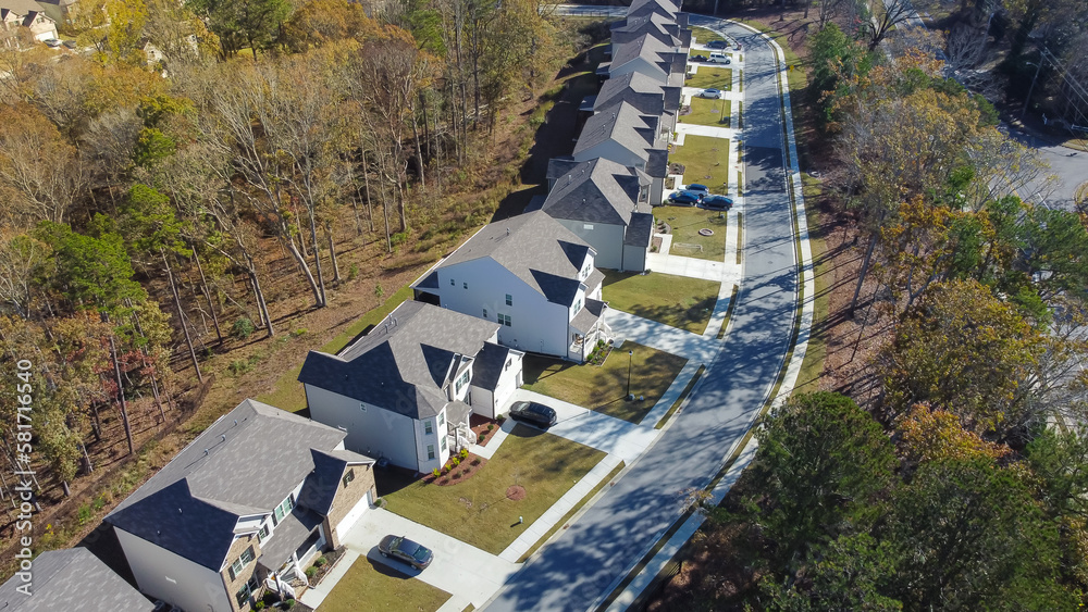 New development residential neighborhood with underground utilities, row of two-story houses, well-trimmed yards, front garage, lush green trees suburbs Atlanta, Georgia, USA