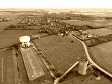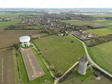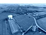 Drone view of a large concrete water tower on the left seen next to a huge chicken shed. A nearly 5G array is seen on a grey water tower.