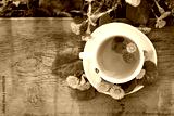 Fresh coltsfoot flowers, ladybug and herbal tea cup in garden, natural background. Healing infusion with Medicinal plant Coltsfoot. Tussilago farfara, spring seasonal flowers. top view. copy space