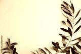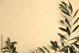 Twig with fresh green olive leaves on beige background, top view. Space for text