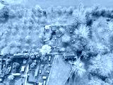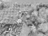 Drone view of many chicken sheds and runs seen together with a small fruit orchard towards the top of the image.