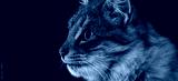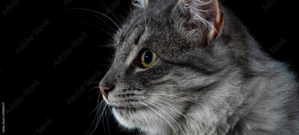 Black cat on a black background. Close-up view head and face of an elegant pet