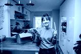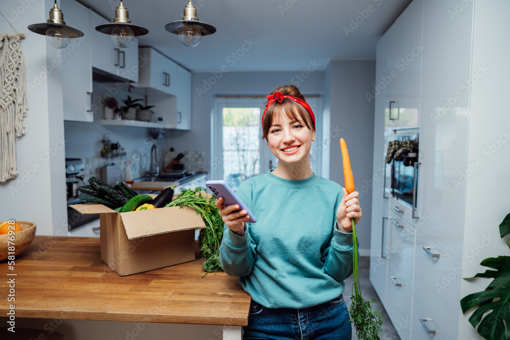 Smiling woman holding fresh carrot from her healthy food delivery box and her phone with order. Box with vegetables on the kitchen table. Start of a healthy life concept. Online home food delivery.