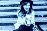 Close up portrait of young smiling fashion woman with fresh tulips holding reusable coffee cup while sitting on stairs at the city street. . Urban street fashion. Springtime mood. Selective focus.