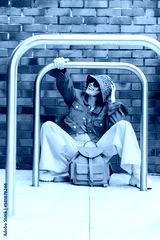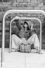Hipster fashion young woman in bright clothes, sun glasses and bucket hat sitting near gray brick wall background with bike stands frame. Urban city street fashion. Vertical card. Selective focus.