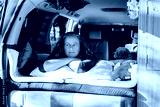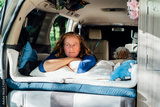 Middle-aged woman relaxing, lying in camper car vehicle and looking out of the window with her cockapoo puppy pet during road trip. Best friend. Enjoying free lifestyle, travel, vacation, freedom.