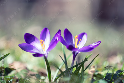 Two spring flower crocus on green grass closeup. Sunny forest on background. Nature photography