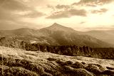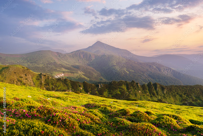 Rhododendron flowers covered mountains meadow in summer time. Purple sunrise light glowing on a foreground. Landscape photography