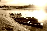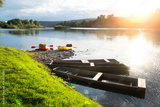 Orange and yellow packrafts rubber boats on a sunrise river near old wooden boats. Packrafting and active lifestile concept