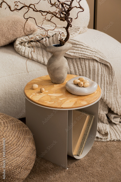 Minimalist composition of cozy living room interior with beige coffee table, stylish wooden panel, gray vase with branch, modern bowl with nuts and personal accessories. Home decor. Template.