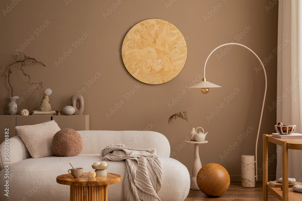 Interior design of cozy living room with wooden wall panel, stylish sofa, round coffee table, brown sideboard, vase with branch, beige lamp and personal accessories. Home decor. Template.